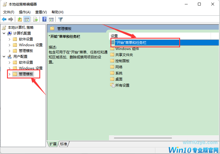 3、进到编辑软件,左边导航栏点击客户配备下的“管理方法模版”,右边点击“开始菜单和任务栏”。