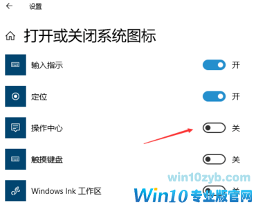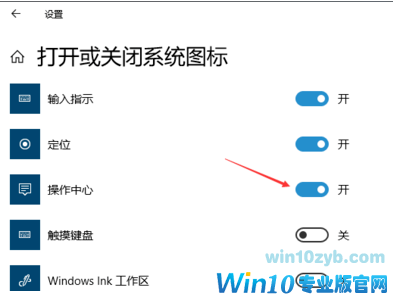 6、随后回到设定对话框,点击“操作中心”按键,就可以实际操作打开了。