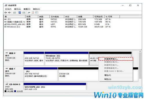 4、在这款区域上右键并选择“新建简单卷”,然后按照说明点击下一步;