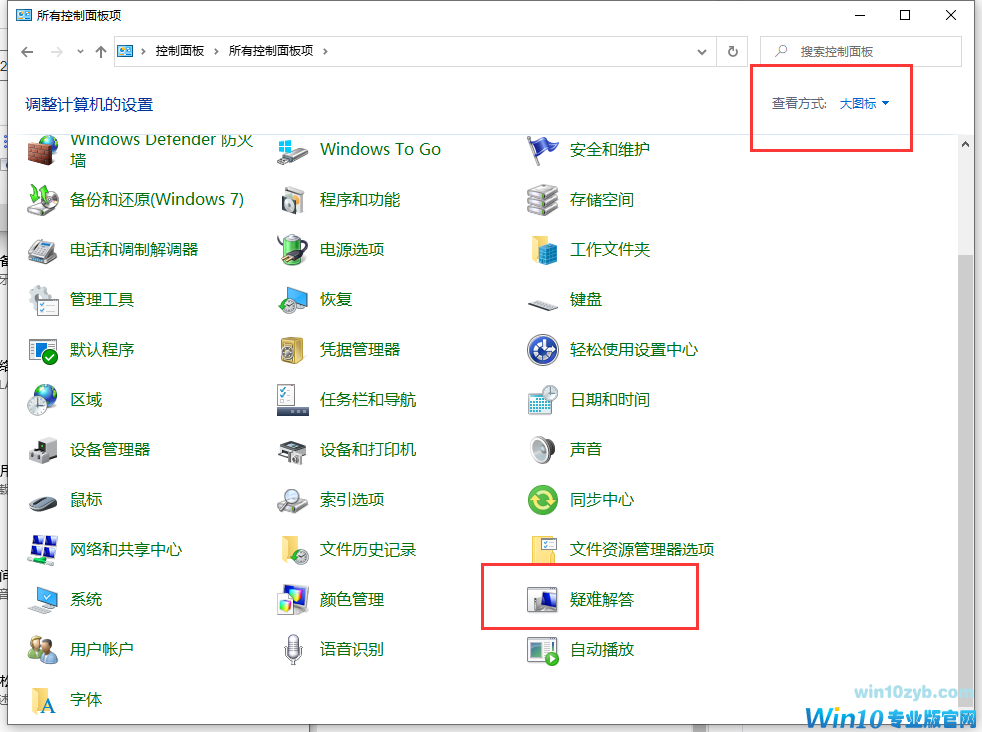 2.输入控制面板-切换到大图标-找到难题后点击。