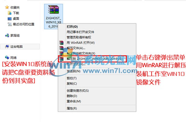 1,在重装WIN10系统之前,把之前系统的重要资料进行备份到其它盘,备份好后到http://www.zjghost.com下载的“装机工作室WIN10系统”到你的电脑的最后一个盘(比如:你的电脑只有C盘,D盘和E盘,那最后一个盘就是E盘),单击右键-弹出菜单-用WINRAR进行解压装机工作室WIN8镜像文件。如下图所示。