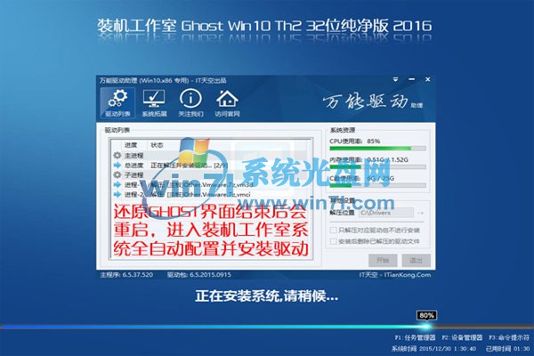 9,还原GHOST界面结速后会重启,进入装机工作室系统全自动配置并安装当前电脑适合的驱动,如下图所示。