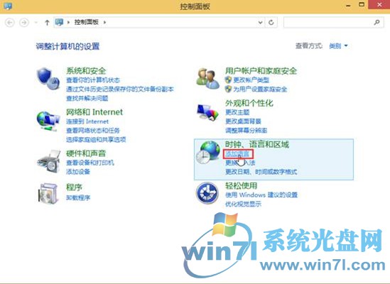 2.在打开的控制面板中,在时钟、语言和区域下点击“添加语言”进入下一步操作。如下图所示