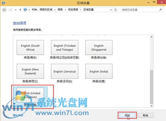 5.点击该语言具体的国家,点击“添加”完成操作。如下图所示