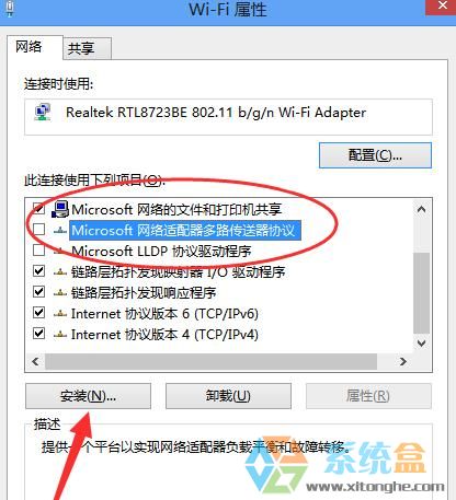 在网络设置对话框,找到【Microsoft网络适配器多路传送协议】选择,然后点击左下角【安装】