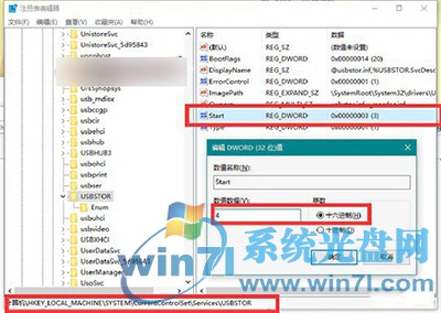 2、进入Win10注册表如下键值:HEKY_LOCAL_MACHINESYSTEMCurrentControlSetServicesUSBSTOR 在右边里面选中start 这个键值并且双击鼠标进行编辑,把默认值3改成4。