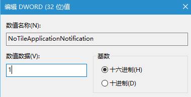 4、选中“PushNotifications”项,然后在右侧空白处单击右键,选择新建—“DWORD(32位)值”,将该值命名为:NoTileApplicationNotification,并将其键值修改为“1”,点击确定。