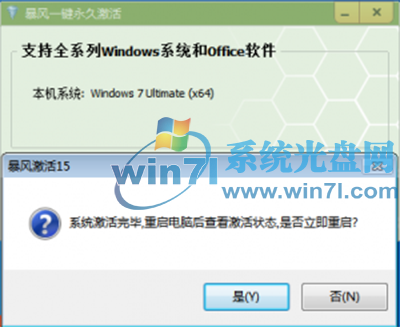 第四步:等待几秒后如果成功激活,会有一个小窗口提示:系统激活完毕,重启电脑后查看激活状态,是否立即重启!