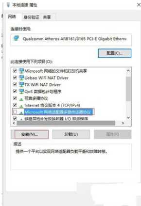 3、选择Microsoft网络适配器多路传送器协议;点击安装;