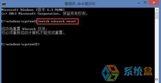 2、进入提示符界面后输入netsh winsock reset 回车键确认;