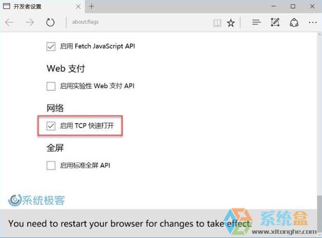 为 Microsoft Edge 启用 TCP Fast Open 的步骤十分简单,只需在地址栏中执行 about:flags — 再在「网络」大项中勾选「启用 TCP 快速打开」— 重启 Microsoft Edge(关掉重新打开)即可。