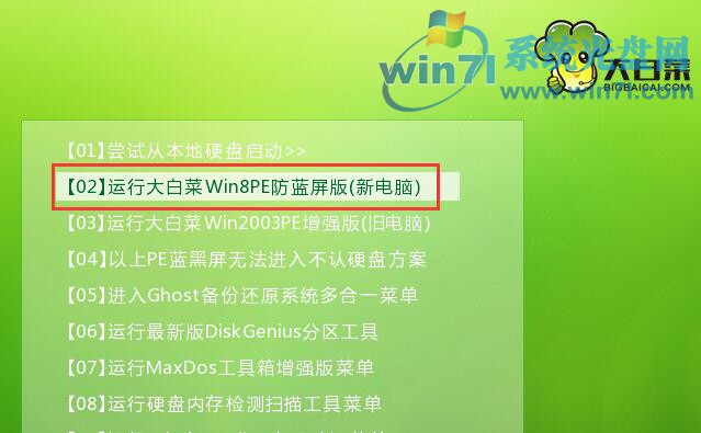 3、进入大白菜主菜单,选择“【02】运行大白菜Win8PE防蓝屏版(新电脑)”回车确认。
