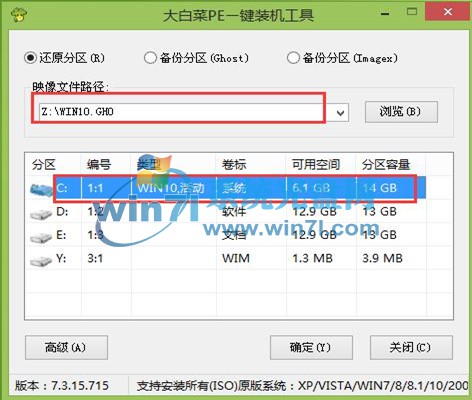 4、打开大白菜PE一键装机工具,点击“浏览”,把win10系统镜像添加进来,选择c盘为安装盘,点击确定。