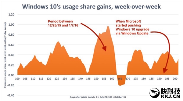 数据显示,2015年底到2016年初的圣诞和新年销售旺季期间,Windows 10的升级使用率是相当突出的,多日连续每天增加0.8-1个百分点。