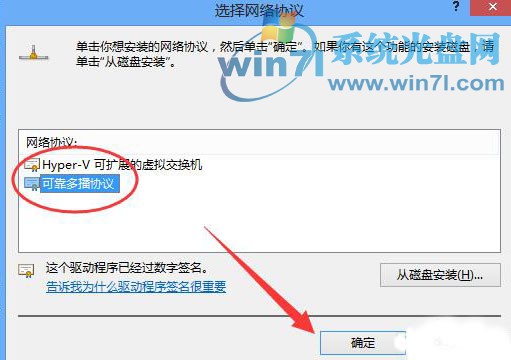 6、选择“可靠多播协议”,点击确定,等待安装成功问题就解决了。