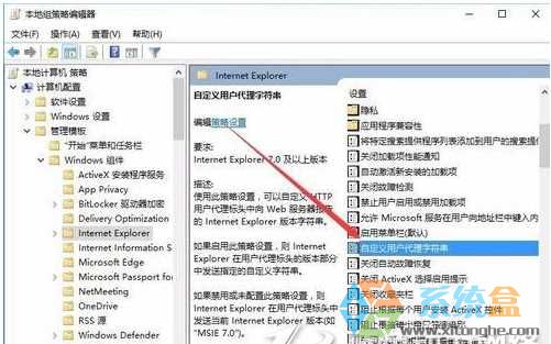 4、在右侧窗口中找到“自定义用户代理字符串”,并双击打开;