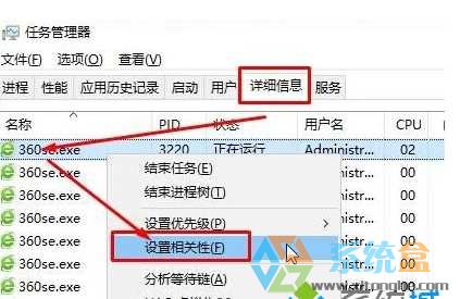 2、切换到“详细信息”选卡,在需要设置的进程上单击右键。选择“设置相关性”;