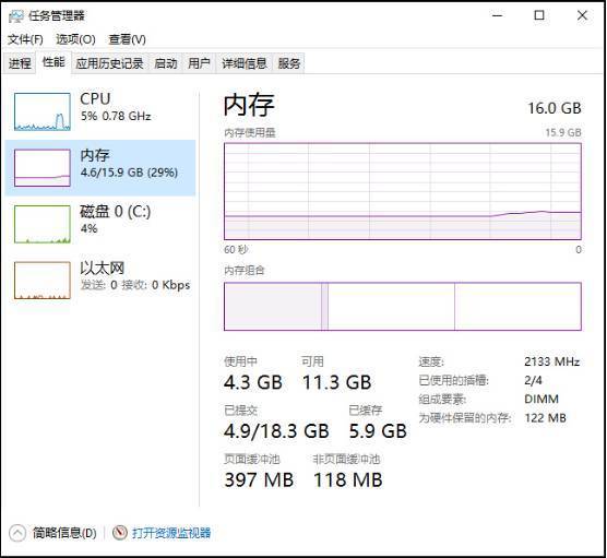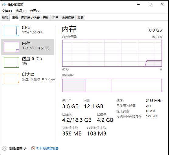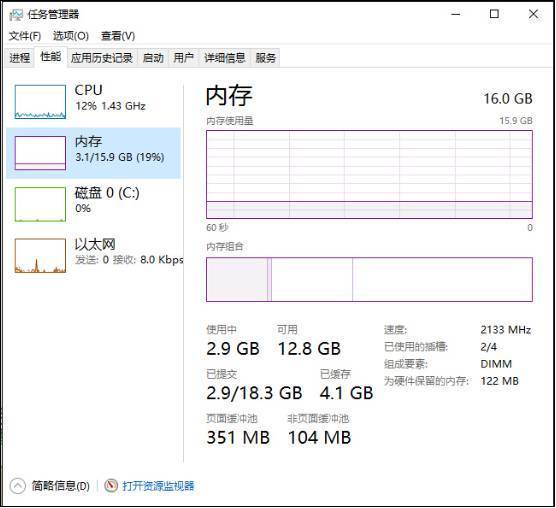 如果你的配置刚好满足这个需求,使用Win10的时候肯定卡顿。你从“任务管理器”中的“性能”参数中一定会发现“系统内存占用很高”,时不时就会提示你内存不足。所以,如果你使用Win10 64位版,还用2GB内存的话一定要赶快升级。