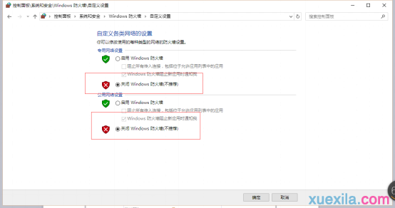 4、在打开的防火墙界面,对于所有的网络位置做设置“关闭windows防火墙(不推荐)”,选择之后,然后确定保存即可。