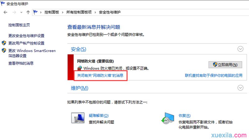打开安全性与维护界面后,安全菜单里会有网络防火墙的信息,点击关闭有关“网络防火墙”的消息;关闭后就不会再有通知了