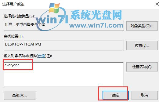 2、点击“添加”,输入对象名称“everyone”点击确定。