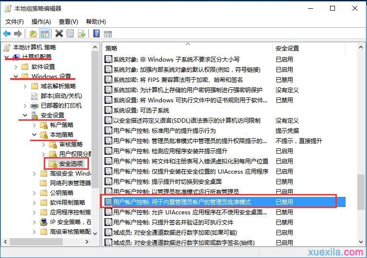 2、在打开的本地组策略编辑器窗口中,依次点击展开“计算机配置→Windows设置→安全设置→本地策略→安全选项”。在安全选项的右侧窗口中找到“用户帐户控制:用于内置管理员帐户的管理员批准模式”。如下图所示