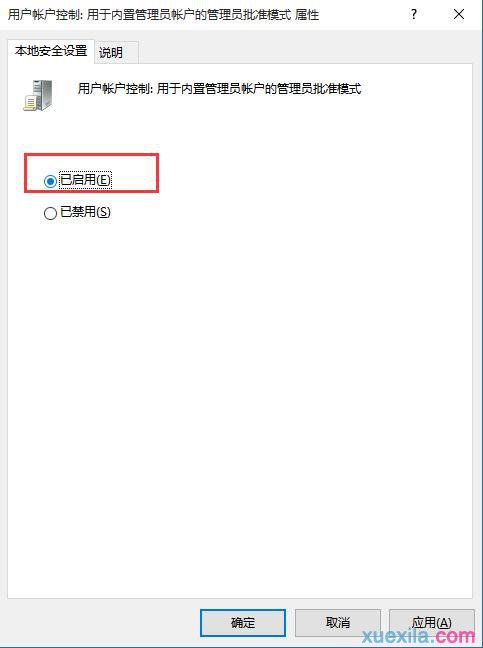 3、双击打开“用户帐户控制:用于内置管理员帐户的管理员批准模式”属性窗口,点击选择“已启用”,再点击“确定”保存设置。如下图所示