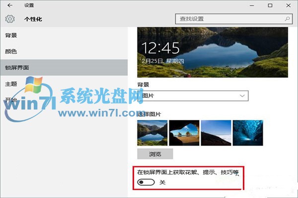 4、关闭“在锁屏界面上获取花絮、提示、技巧等”。