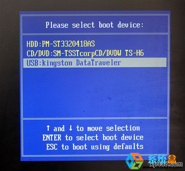 1、将U盘插入到电脑,开机后按《启动项选择快捷键大全》并选择U盘启动,示例如下图: