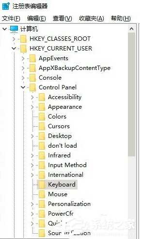 3、在注册表编辑器我的电脑下依次打开HKEY_CURRENT_USER,Control Panel,Keyboard;