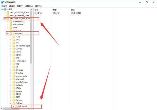 2、在【注册表编辑器】展开以下位置:HKEY_LOCAL_MACHINE\SOFTWARE\Policies\Microsoft\Windows\,如图: