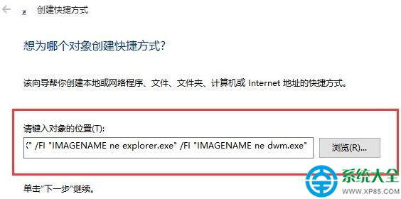 2、然后在请键入对象的位置中输入:taskkill /F /FI "USERNAME eq XXX" /FI "IMAGENAME ne explorer.exe" /FI "IMAGENAME ne dwm.exe" (这里的XXX表示当前的用户名),点击下一步;