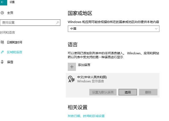 2.在区域与语言右侧的语言栏中选中中文的选项。