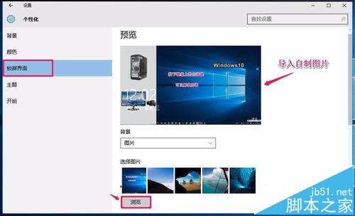 4、点击系统桌面左下角的【开始】-【设置】-【个性化】,在个性化窗口,点击左侧的锁屏界面,在对应的右侧窗口点击浏览,导入图片;
