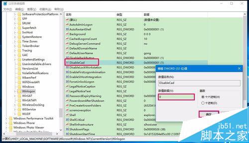 6、在Winlogon对应的右侧窗口找到DisableCad(禁用计算机辅助设计),左键双击DisableCad,在弹出的编辑DWORD(32位)值对话框中,把DisableCad数值数据从“1”更改为“0”,再点击:确定,退出注册表编辑器。