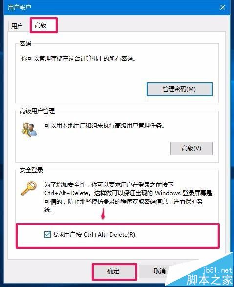 2、在打开的用户帐户设置窗口,点击【高级】,再点击【安全登录】项的要求用户按Ctrl+Alt+Delele(R)打勾,最后点击:应用 - 确定。