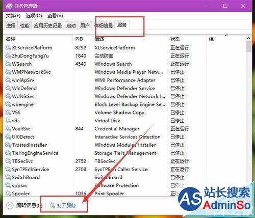 2、打开Windows系统中的任务管理器页面之后,点击页面顶端的”服务“选项,点击页面底端的”打开服务“选项。