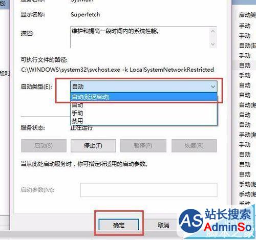 4、打开Superfetch服务页面之后,在弹出的属性菜单页面设置中将其设置为”自动延迟“启动,并点击确定按钮,通过延迟启动该服务的方式来达到释放系统内存压力的目的。