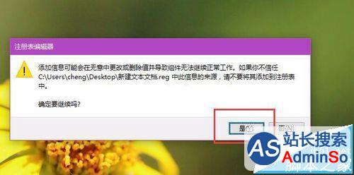 4、接下来,我们双击刚才创建好的注册表导入文件,然后在弹出的消息提示确认框中点击确定按钮,将该项内容导入到注册表中即可。