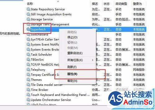 3、打开Win10系统中的服务组件之后,在服务页面中找到”Superfetch“选项,然后击右键选择”属性“菜单按钮。
