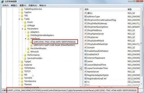 2、依次展开下面的选项:HKEY_LOCAL_MACHINE\SYSTEM\CurrentControlSet\Services\Tcpip\Parameters\Interfaces\{24FC2D6C-7FAC-47A6-A0FE-585FF3F65816};