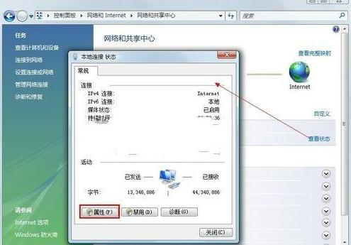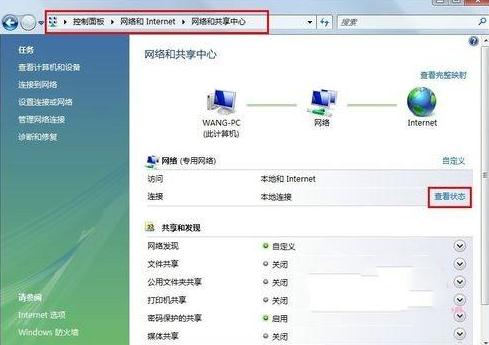 1、先打开控制面板,然后打开网络和INTERNET,再打开网络和共享中心,找到本地连接,再单击“查看状态”选项。