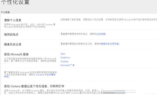 将页面中“其他Cortana数据以及个性化语音、印刷和打字”选项清除,这样保存在云端的隐私数据就被清除掉了。