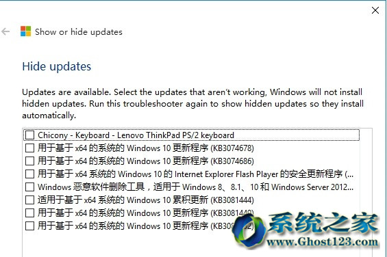 3、下载到wushowhide.diagcab后双击打开,开始疑难解答 工具会自动搜索到可用的更新,我们在其中选择并隐藏不需要的更新即可。