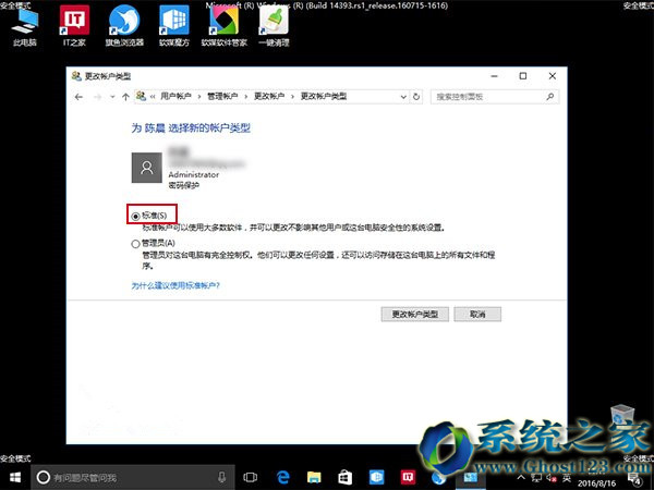4、此时调整账户等级,如果之前是管理员,那么可暂时调整为“标准”账户