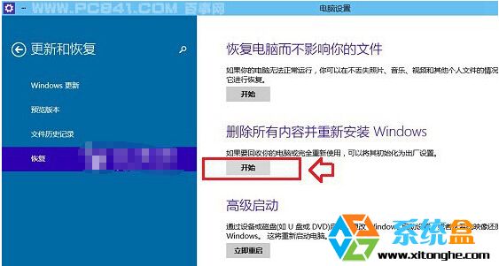 4、在恢复选项中有几个恢复方式,【恢复电脑而不影响你的文件】该项可以恢复系统原文件而不会丢失你安装系统之后创建的文件,【删除所有内容并重新安装】则跟重装系统差不多,如果系统盘中没有什么重要的文件的话,小编推荐使用【删除所有内容并重新安装】选项,让系统恢复的更为彻底,点击下图中的“开始”按钮进入下一步;