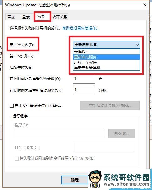刚才的窗口别急着关闭,仔细看看上面选项卡,还有个“恢复”项目呢,问题就出在这儿了。系统默认当第一次失败后“重新启动服务”。