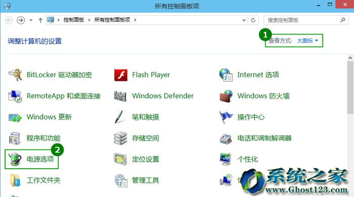 1.在控制面板中打开“电源选项”(查看方式为大图标)。