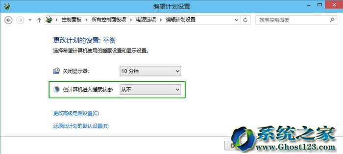 3.将“是计算机进入睡眠状态”设置为“从不”。“关闭显示器”时间建议保持默认,关闭显示器不会影响电脑的运行。