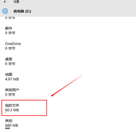 4、进入c盘后,系统会列出存储使用情况,我们选择临时文件,如下图所示: